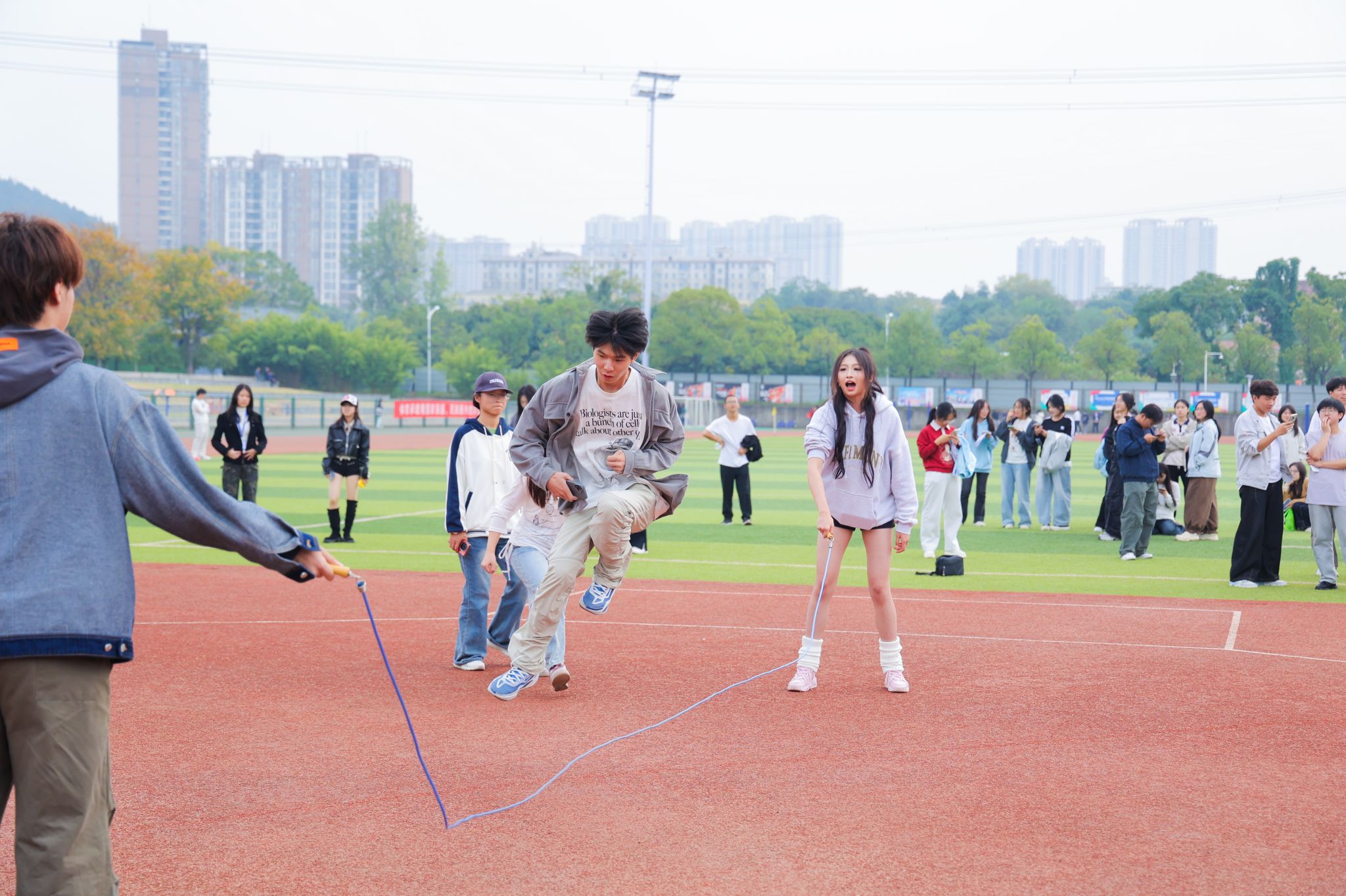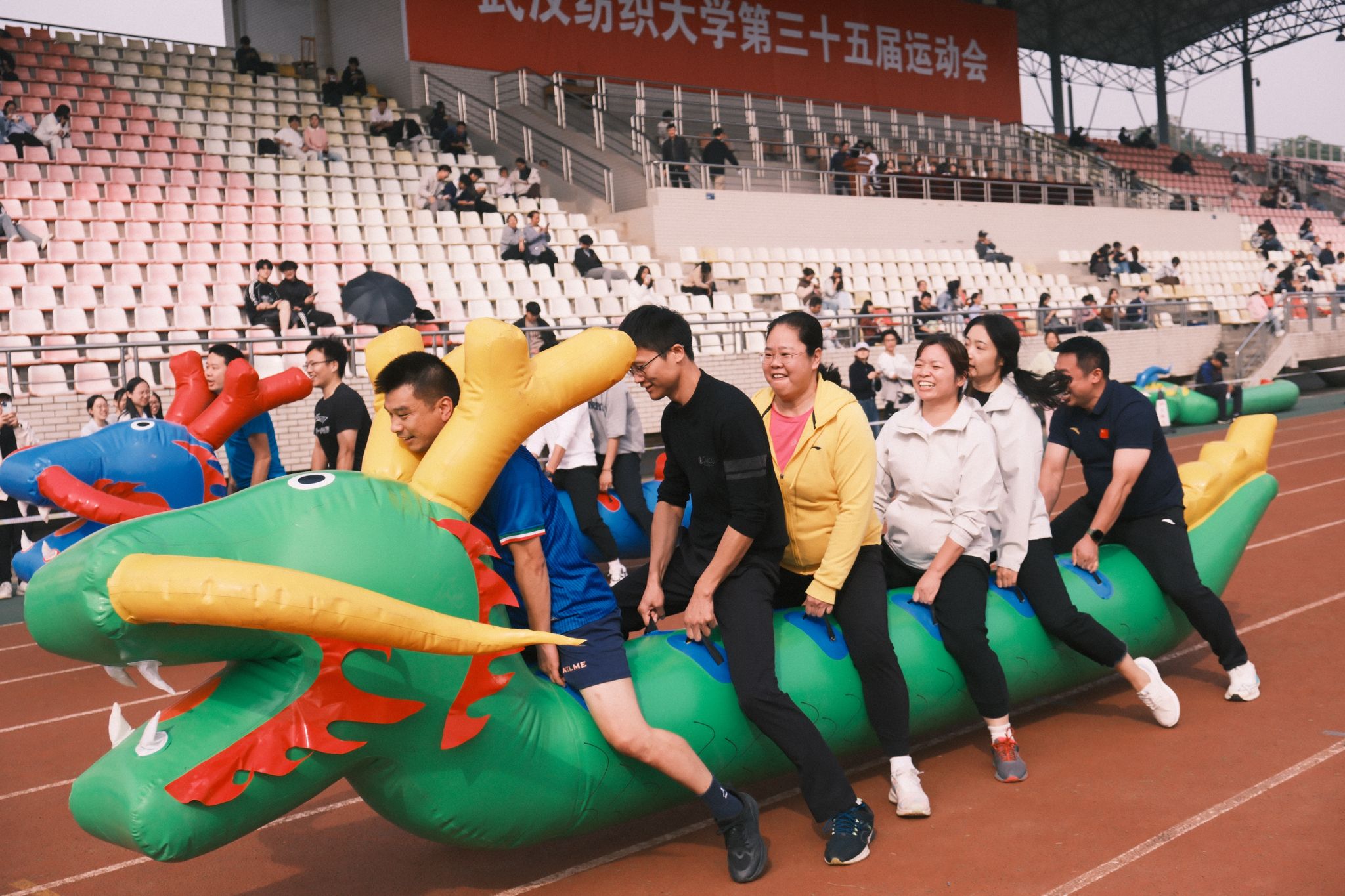 开幕式结束后,运动场瞬间铺开一幅活力的画卷。径赛区内,选手如离弦之箭般疾驰,奋力冲刺的身影与白色跑道交织,定格成一道道动感风景。田赛区内,跳高、跳远运动员助跑、起跳、腾空、落地,轻盈的身姿在空中划出优美弧线,引来阵阵喝彩。集体项目是团队精神最生动的注脚。跑道一侧,接力队员在信任的传递中完成默契的协作;赛场另一端,拔河选手用通红的脸色与震天的呐喊,将集体力量推向顶点——这既是意志的比拼,更是信念的交融。此外,现场还有师生趣味项目如龟兔赛跑、八字跳长绳等,融趣味性与竞争性于一体。师生们并肩作战,在默契配合中增进了情谊,欢声笑语回荡在运动场的每一个角落。观众席上,各学院啦啦队创意纷呈,有的挥舞着彩旗,有的敲打着锣鼓,鼓掌声、喝彩声、呐喊声交织在一起,共同奏响了一曲最动人的赛场乐章。