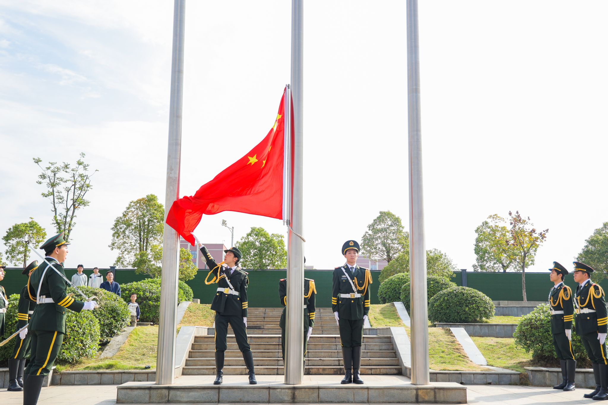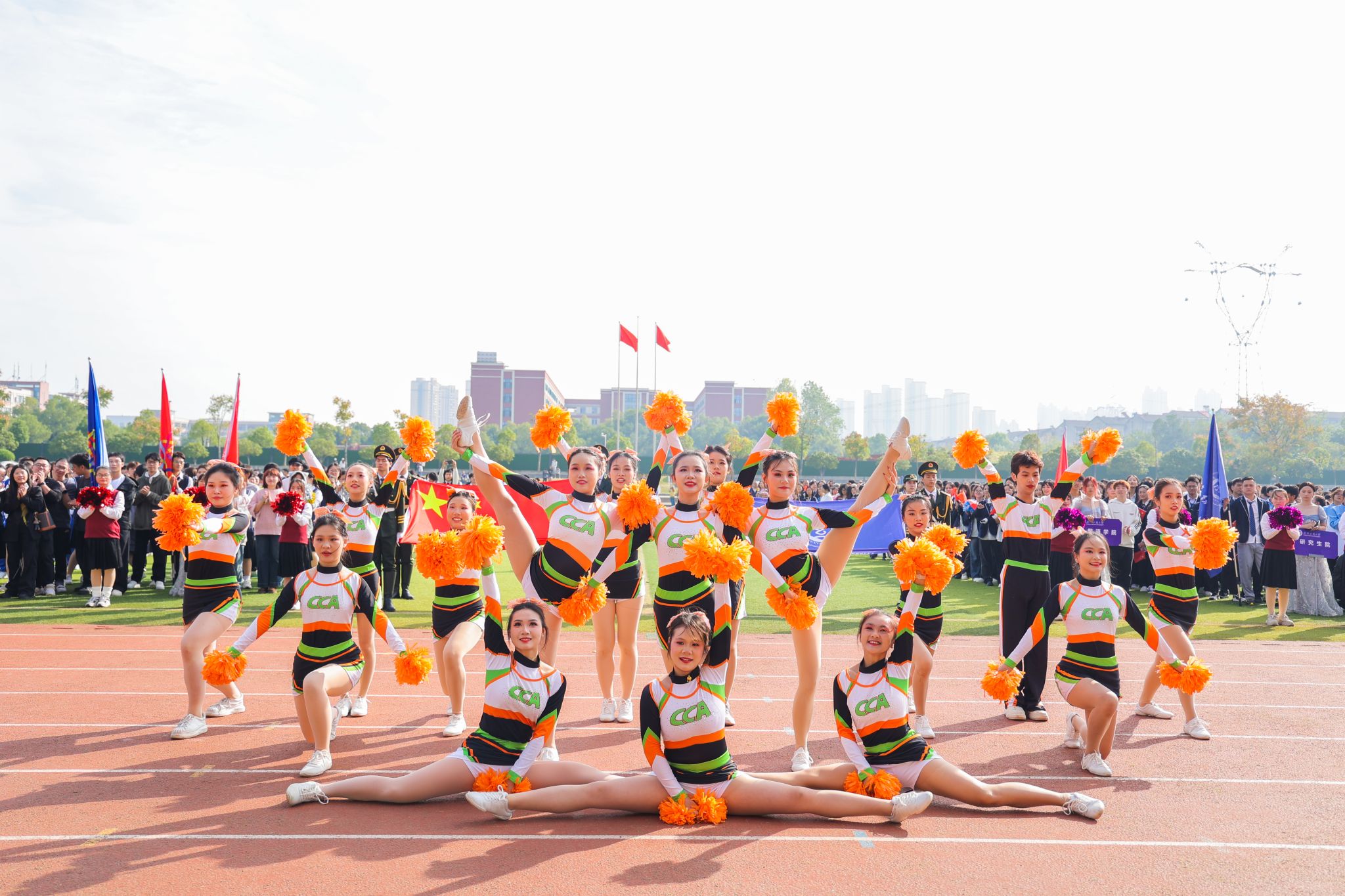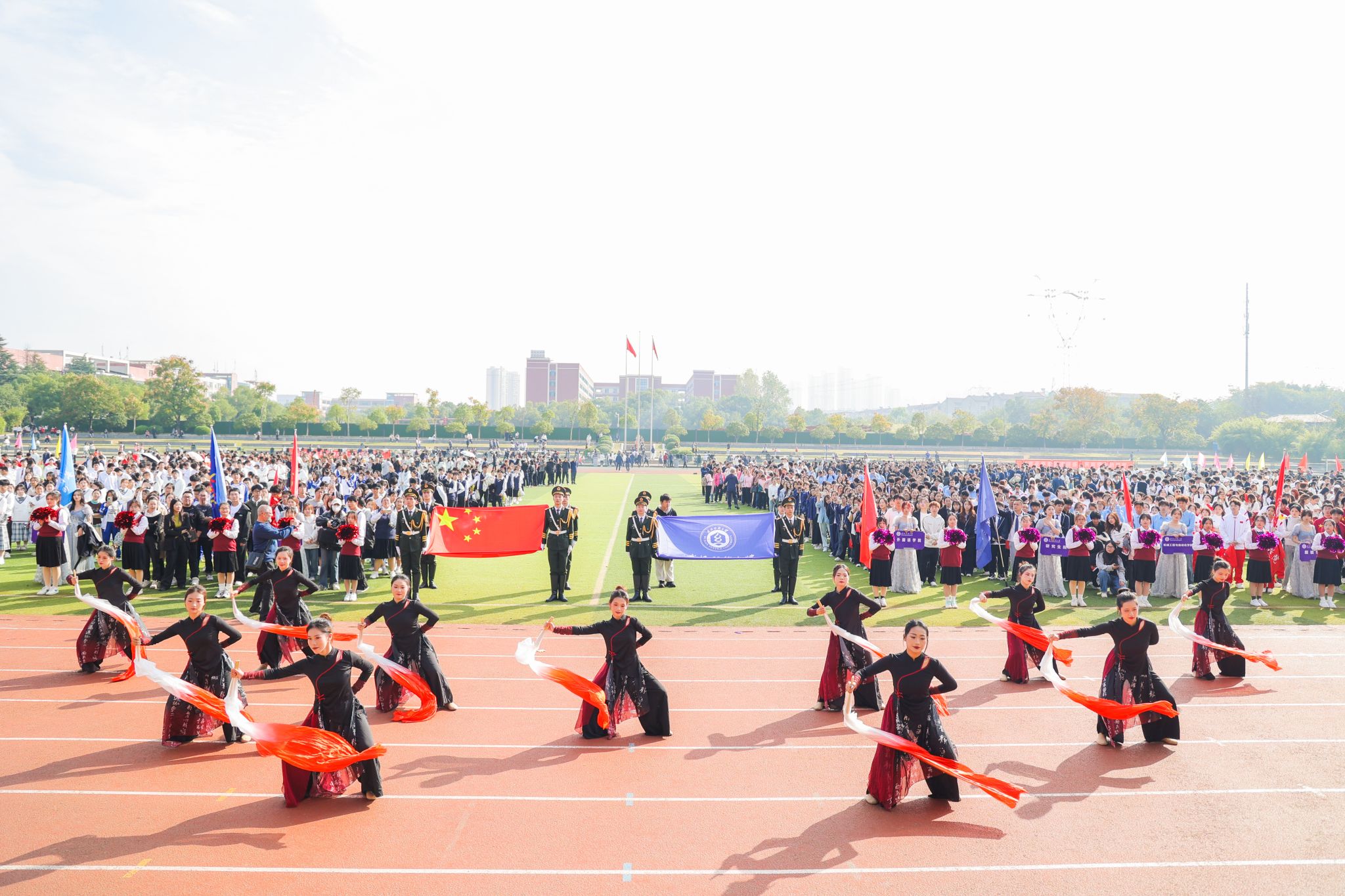 伴随着激昂的《运动员进行曲》,国旗护卫队迈着整齐有力的步伐率先入场,他们身姿挺拔,眼神坚定,彰显着对国旗的敬重与守护。随后,各学院学生代表、教职工代表队等多个检阅队依次经过主席台接受检阅。他们精神抖擞、神采飞扬,铿锵有力的步伐、高亢嘹亮的口号,充分展现了纺大师生朝气蓬勃的精神风貌。入场式舞蹈表演节目更是精彩纷呈,演员们活力四射的表演瞬间点燃了全场热情,欢呼声、掌声此起彼伏。