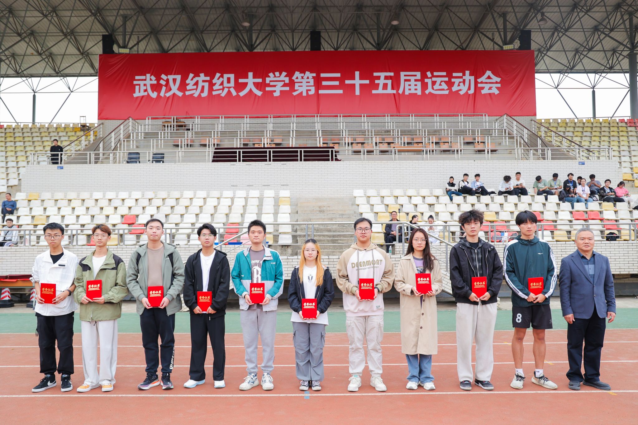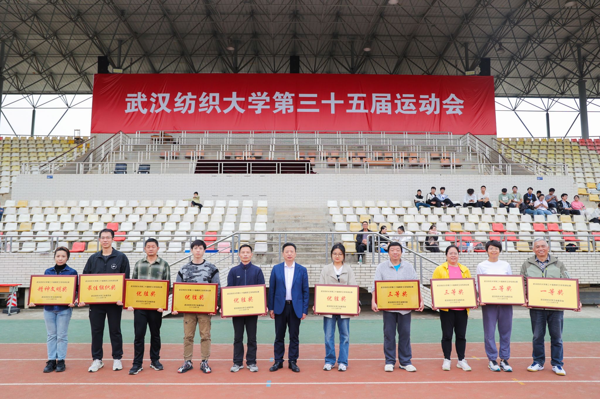 校党委书记徐卫林,纪委书记程碧海,校工会、体育部及校体育委员会委员出席1日下午举行的闭幕式,并为获奖代表颁奖,合影留念。第三十五届运动会圆满结束,此次运动会不仅是体育竞技的舞台,也是青春活力的释放场。恰同学少年,风华正茂;逞飒爽英姿,青春激扬。相信在未来的日子里,全体师生将继续保持“闯”的精神、“拼”的劲头,让体育精神融入校园生活,在运动中锤炼意志,塑造品格,为推动新时代校园体育事业发展、培养全面发展的时代新人贡献力量。