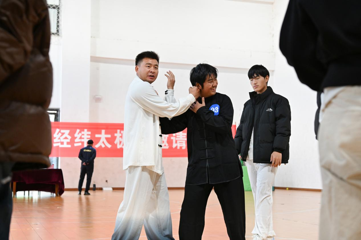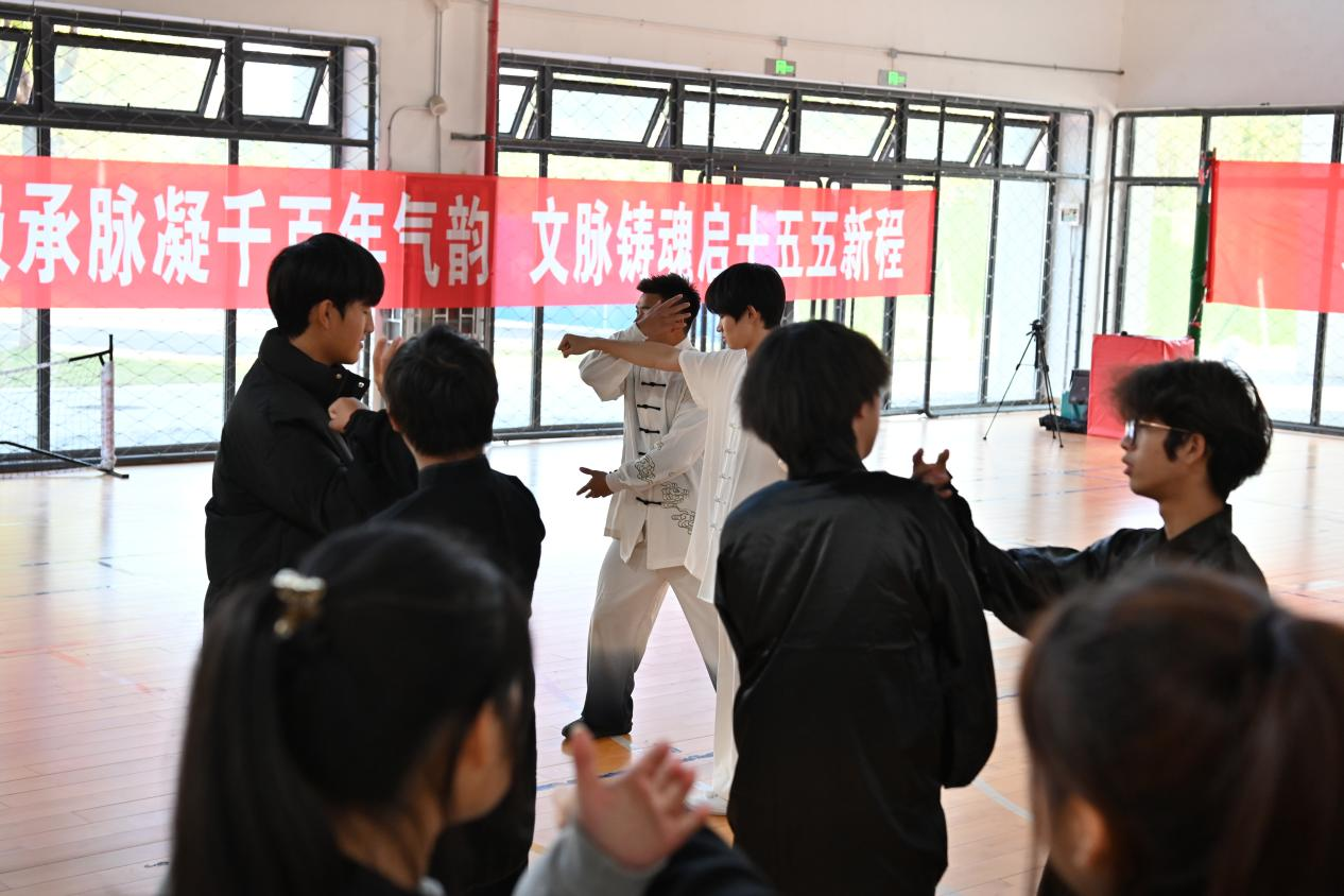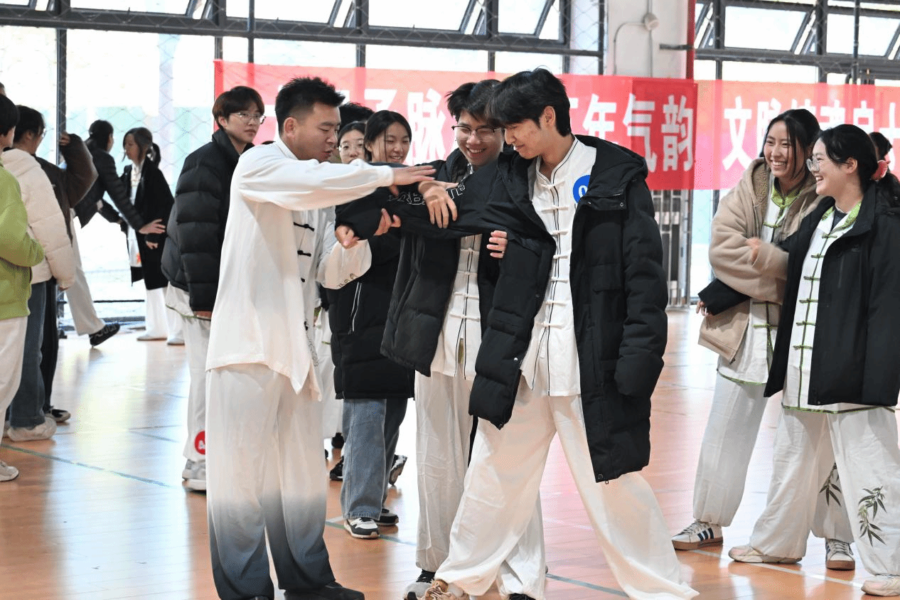 赛事全程透明公开,男女组按序号分组上场,每组赛后裁判现场亮分,成绩实时公示。中场休息时,校武术协会指导老师表演陈式太极拳,队员展示初级剑,专业招式获全场掌声。后续的太极拳攻防情景互动环节,指导老师通过 “示范 + 模拟 + 体验” 普及太极攻防知识,让现场师生直观感受传统武术实用价值。